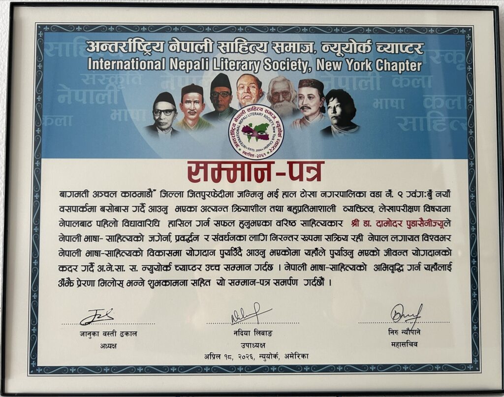 नेपाली भाषा र साहित्यको जगेर्ना तथा प्रवर्द्धनमा निरन्तर रूपमा जीवन्त योगदान पुर्याउँदै आउनुभएका स्रष्टाको कदरस्वरूप च्याप्टरले प्रमुख अतिथि वरिष्ठ साहित्यकार डा. दामोदर पुडासैनीलाई सम्मानपत्र प्रदान गरेको थियो। उक्त सम्मानपत्र च्याप्टर अध्यक्षले पढेर सुनाउँदै हस्तान्तरण गर्ने जानकारी दिनुभएको थियो।